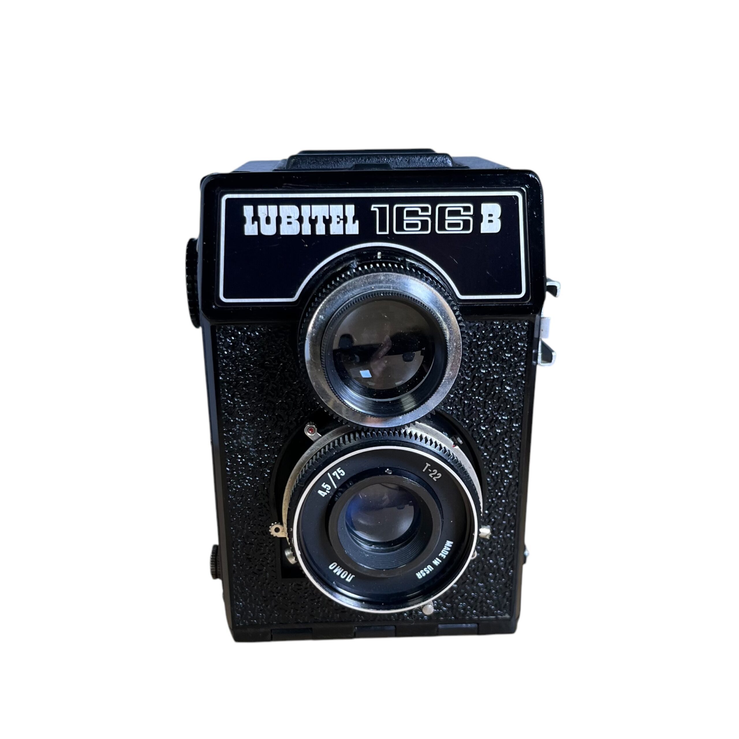 La Lubitel 166B utiliza película de 120 mm y expone imágenes cuadradas de 6 x 6 cm. Las velocidades de obturación van de 1/250 a 1/15 y se puede ajustar con una bombilla. El obturador está sincronizado con el flash, con una toma para PC en el cuerpo del objetivo y una zapata fría en el lado izquierdo de la cámara. El objetivo es un triplete T-22 de 75 mm f/4,5 con revestimiento, con una apertura de f/22 y un límite de enfoque cercano de poco más de un metro. Admite parasoles con rosca de 40,5 mm y filtros.